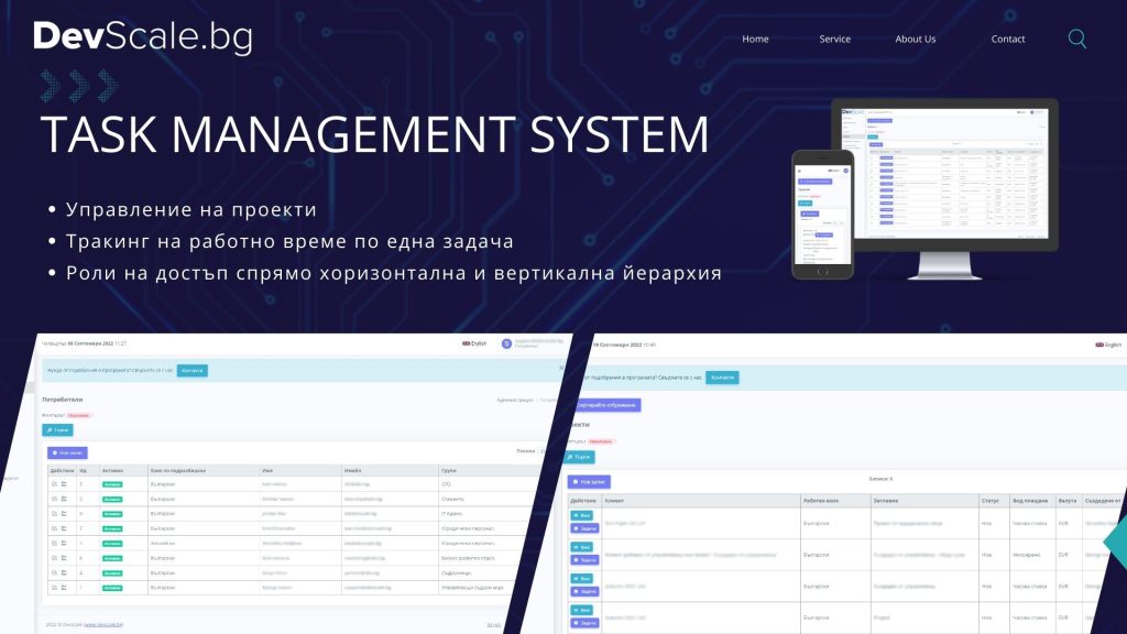 - Task Management System – персонализирано решение за управление на задачи и отчитане на работния процес. Целта на системата е да осигури по-ясна проследимост в работните задачи на всички служители в дружеството. Това се случва с различни нива на достъп и роли в системата. През системата могат да бъдат генерирани отчети и протоколи за работа по даден проект, които да бъдат предоставяни на клиентите.