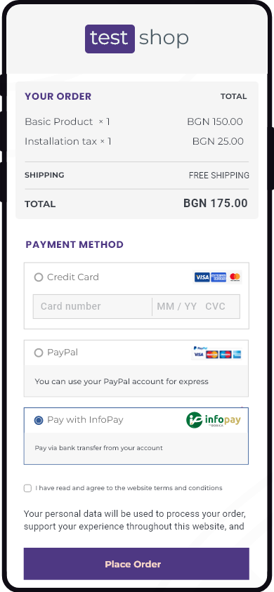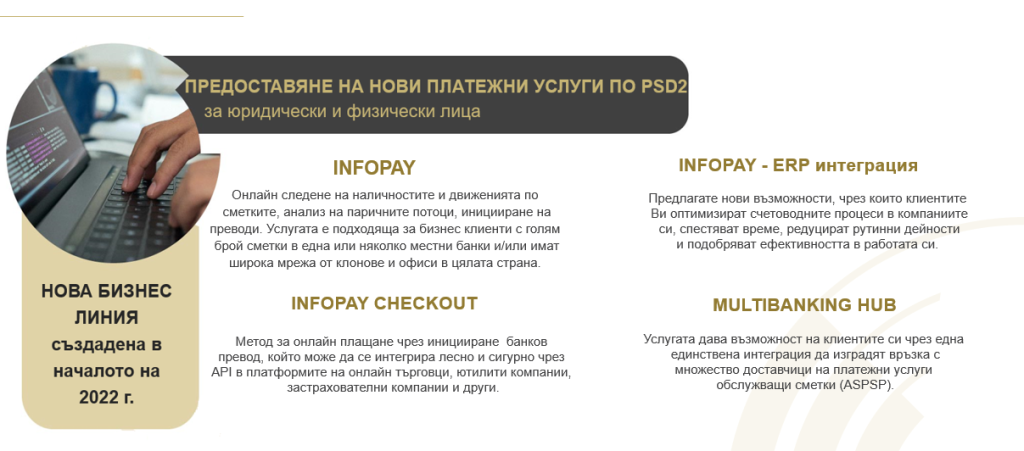Най-новата услуга – InfoPay Checkout, предоставя на търговците и техните клиенти допълнителна възможност за онлайн разплащания чрез банков превод, директно в техните онлайн магазини. Наред с удобството, услугата се реализира при високо ниво на сигурност в целия платежен процес. Решението е подходящо за всякакви търговци, като има възможност то да бъде интегрирано директно в ERP системите на търговеца.