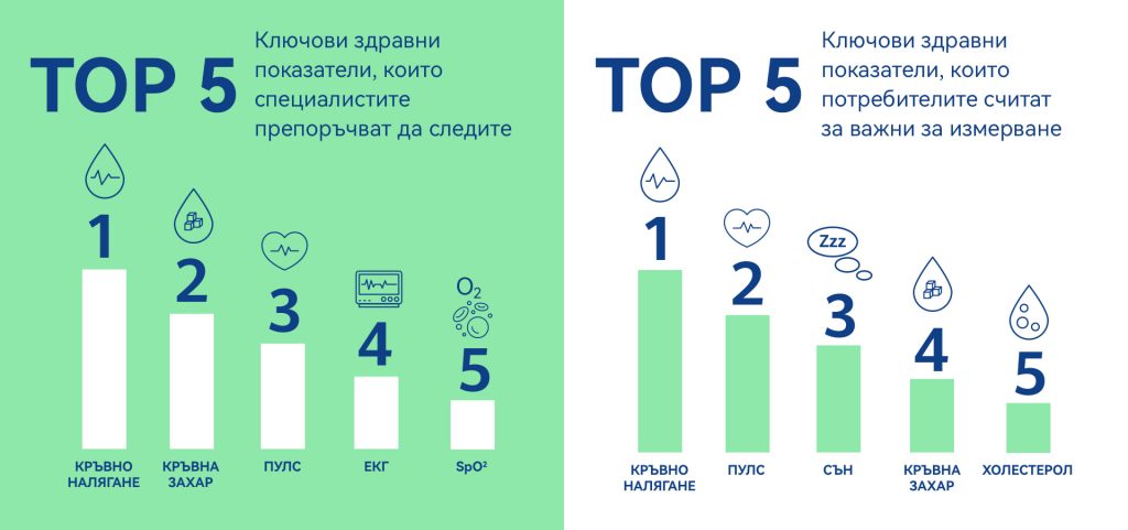 Препоръките за наблюдение на здравето от здравните специалисти съвпадат с мнението на потребителите относно важността на определени показатели за общото здраве: кръвното налягане се посочва от европейците като най-важния здравен показател (76%), близко следвано от сърдечната честота (пулса).
