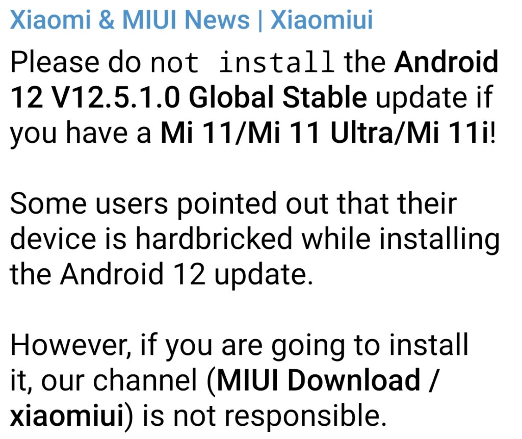 След инсталиране на актуализации с номера „V12.5.1.0.SKBMIXM“, „V12.5.1.0.SKKMIXM“, „V12.5.1.0.SKAMIXM“ съответно за Xiaomi Mi 11, Mi 11i и Mi 11 Ultra, смартфоните стават неизползваеми. Единствения начин да се върнат към живот, е потребителите да се свържат със сервизния център.
