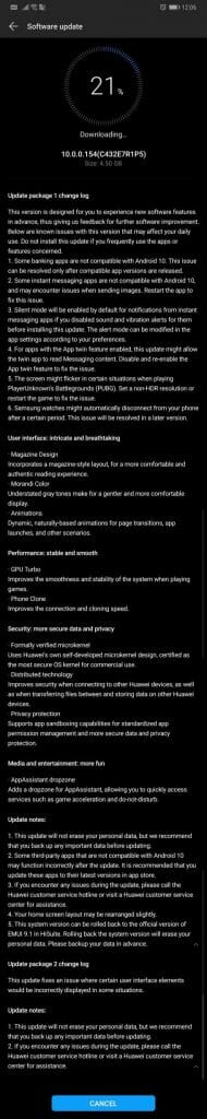Актуализацията за P30 е с размер 4.47GB , а версията на EMUI е EMUI 10.0.0.168.