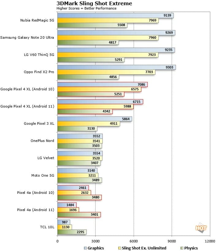 Ако стартираме 3D Mark на Pixel 4 XL, базиран на Android 10 и Android 11, тогава ще видим, че със старата версия на ОС, смартфонът ще покаже по-високи резултати. Друг е въпросът, че понижението на производителността не може да се нарече критично, но спада с 5-7%, което бенчмарка регистрира, не може да се счита за статистическа грешка.