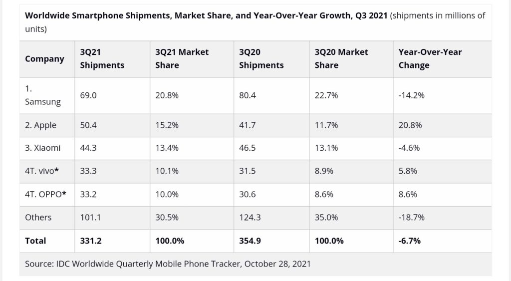 От юли до септември 2021 г. на пазара са доставени общо 331.2 милиона смартфона, което е по-малко в сравнение със същия период на миналата година, когато доставките възлизат на 354,9 милиона устройства. Общия спад в доставките е 6.8%.