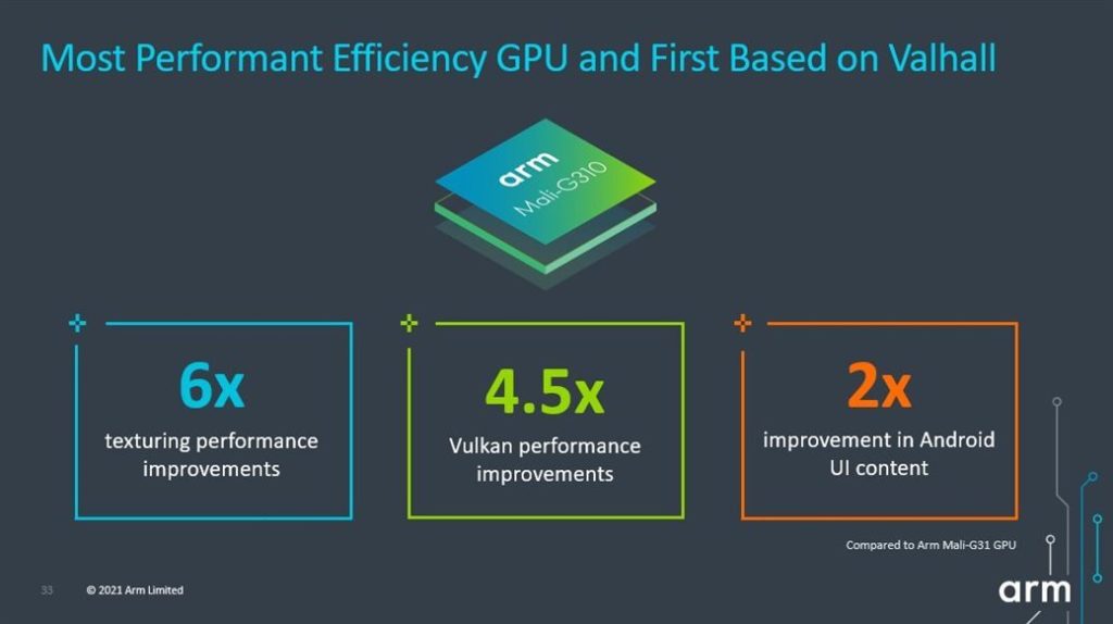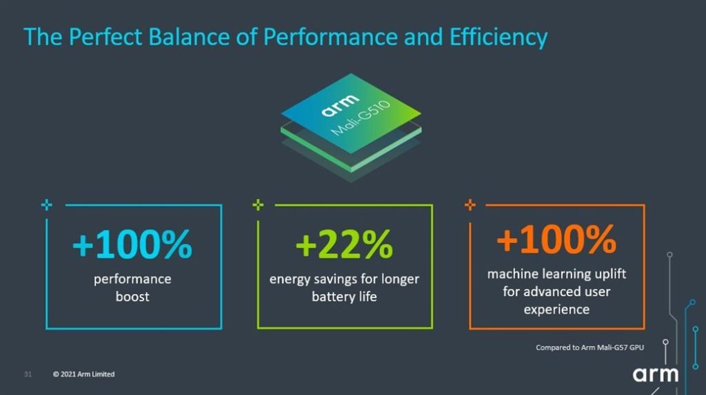 ARM обявиха и три нови графични ядра – Mali-G710 – с 20% по-висока производителност при игри и 20% по-ниска консумация на енергия, графичният процесор от среден клас Mali-G510 и Mali-G310, предназначен за бюджетни смартфони.
