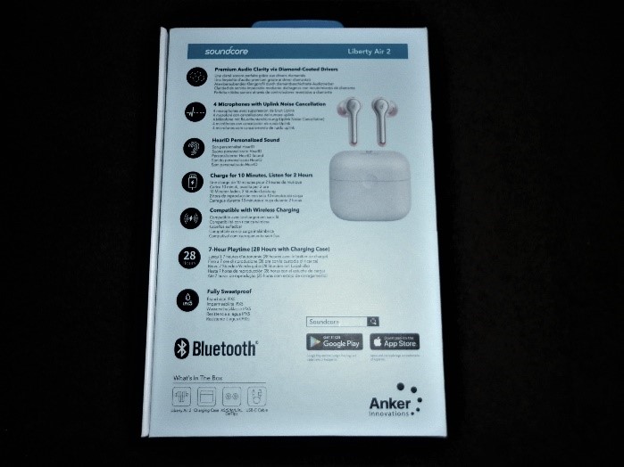 Ето и кутията, в която пристигнаха безжичните слушалки Anker Soundcore Liberty Air 2 – с изглед от четирите страни: