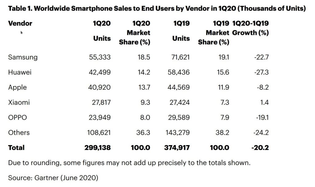 “Класирането” остава почти непроменено, като Samsung остават на първо място, въпреки сериозния спад в продажбите от 22.7%, следвани от Huawei, Apple , Xiaomi и Oppo. Интересното е, че Apple имат по-малък спад от Oppo, Samsung или Huawei, които са и големият губещ, и е са с най-голям спад в Топ 5.