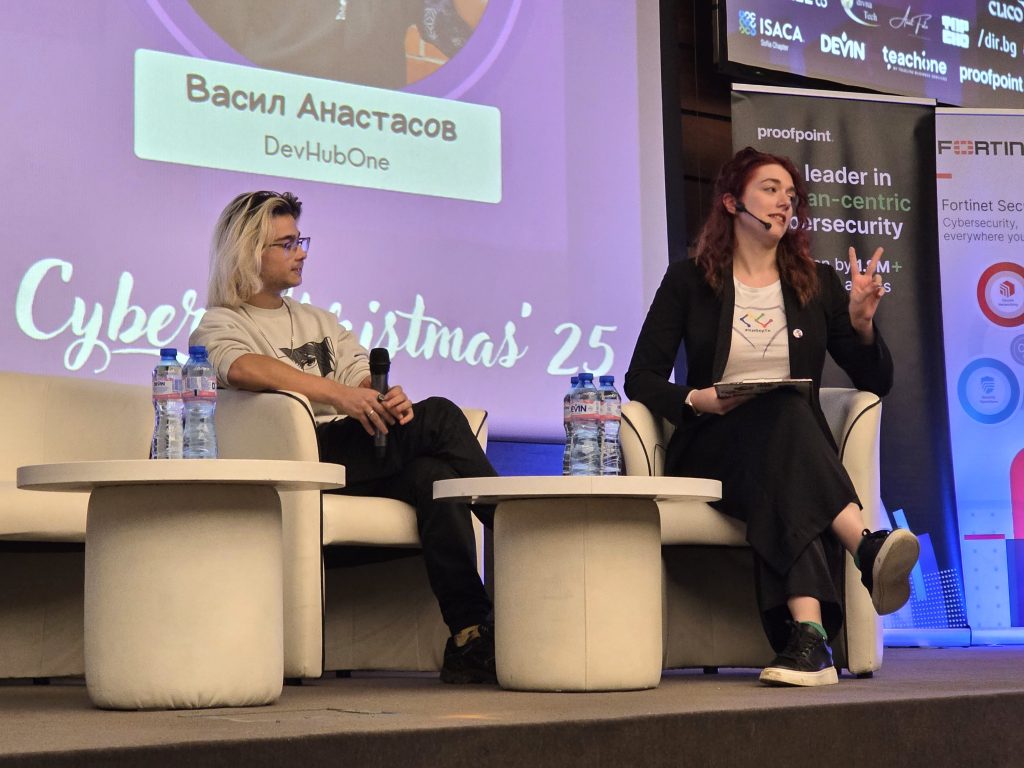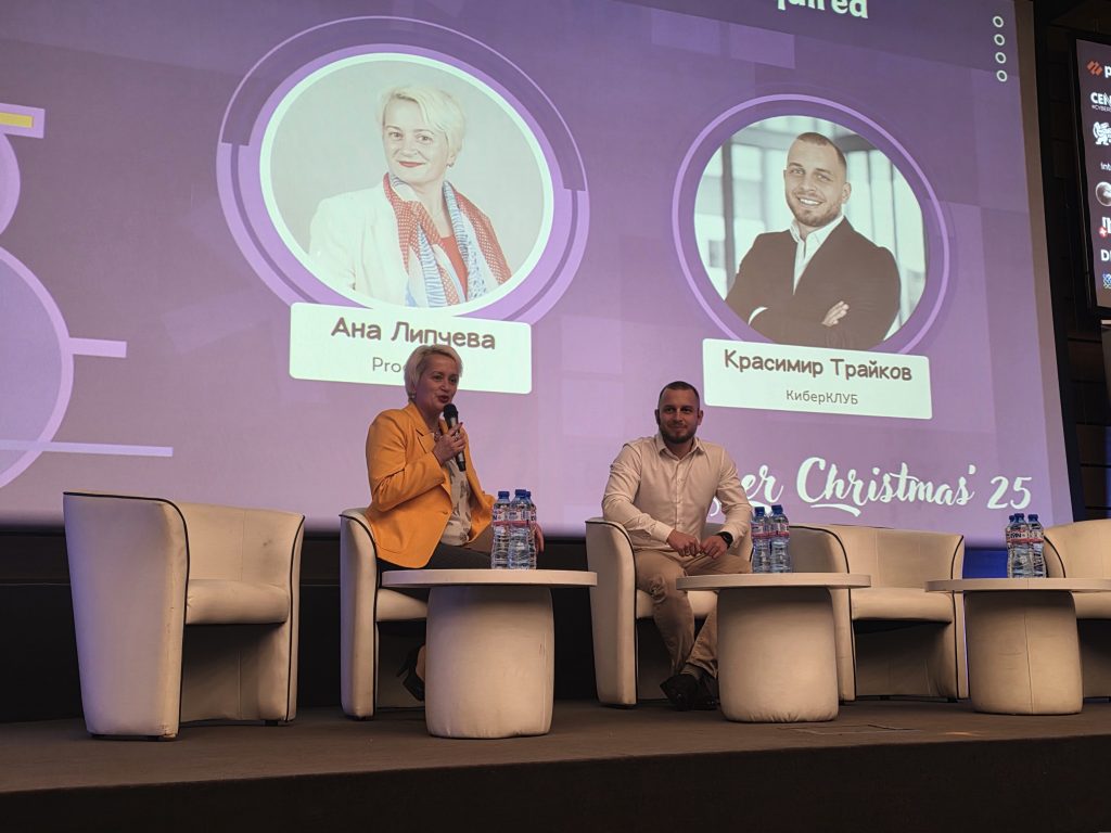 Вторият панел на Cyber Christmas ’25 събра на сцената Ана Липчева, представител на Proofpoint и Красимир Трайков – партньори в обща кауза: да направят обученията по киберсигурност реално работещи, а не просто формална отметка в графика.