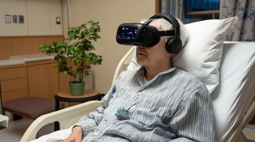- Възрастен човек в болнична среда преодолява предизвикателствата на изолацията благодарение на VR технологиите.