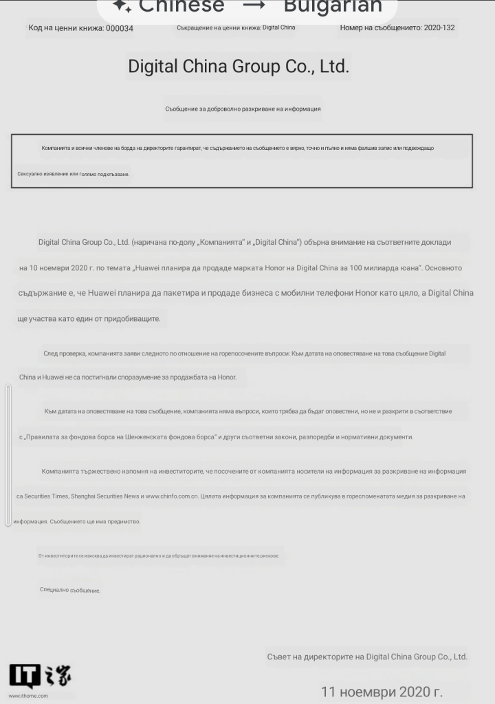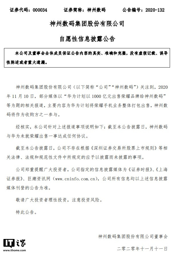 В съобщението се казва, че компанията е обезпокоена от появилите се на 10 ноември 2020 г. съобщения в някои медии, озаглавени: „Huawei планират да продадат марката Honor на Digital China за 100 милиарда юана.“ Основната теза е, че Huawei планират да продаде целия си бизнес с мобилни телефони “Honor”, а Digital China ще участват в покупката.