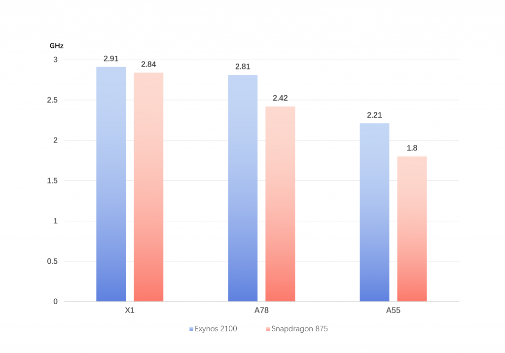 Разликите обаче са в тактовите честоти, при които ще работят ядрата, съответно ядрото на Cortex-X1 на Exynos 2100 ще има максимална честота от 2,91 Ghz, трите му ядра Cortex-A78 ще работят на 2,81 Ghz, а четирите ядра на Cortex-A55 ще бъдат с тактова честота от 2,21 Ghz.