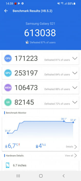 С официалното представяне на серията Galaxy S21, разполагаме и с първи официален бенчмарк резултат за Exynos 2100 в телефона Galaxy S21+ в AnTuTu. За сравнение със Snapdragon 888 използваме резултат с Xiaomi Mi 11, който беше първия телефон с най-новата и мощна мобилна платформа на Qualcomm.