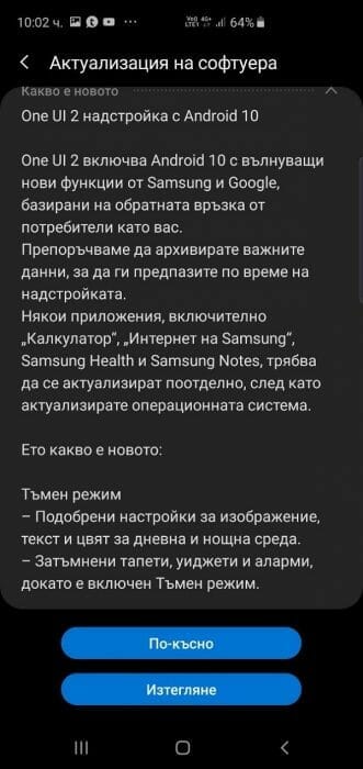 Samsung изненадаха всички, като предоставиха ъпдейта до Android 10 преди края на календарната година, и изпревариха предвидените дати. С Android 10 устройствата получават и OneUI 2.0. Тази актуализация не е толкова значима, като прехода от Samsung Expirience до OneUI 1.0, но предоставя по-плавно и завършено преживяване на потребителите чрез усъвършенстване на софтуера.