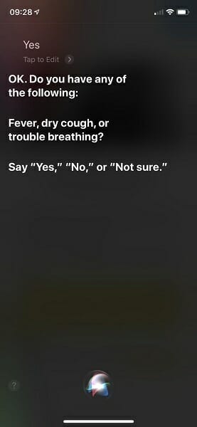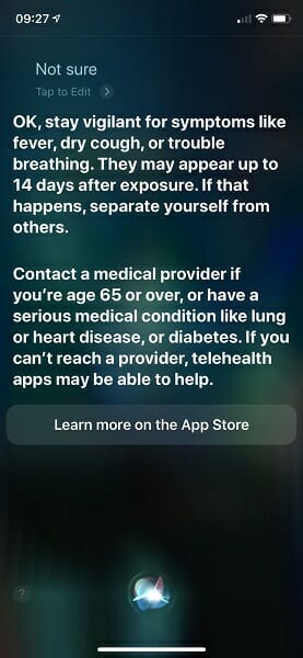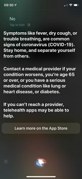 Когато попитате гласовия асистент за вируса, Siri първо ще Ви попита дали имате някой от симптомите, които включват треска, суха кашлица или затруднено дишане. Хората с по-сериозни заболявания е препоръчително да позвънят на номерата за спешна помощ, и ако имат съмнения, че са заразени с COVID-19, е силно препоръчително да се самоизолират.