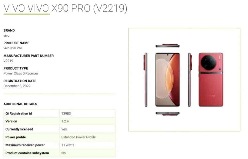 Информацията от уебсайта на Wireless Power Consortium включва рендер, който показва дизайнa на Vivo X90 Pro. От него е видно, че глобалната версия няма да се различава от версията за Китай, а друга любопитна подробност е, че максималната безжична мощност, получена по време на теста е 11 W, което вероятно е някаква грешка.