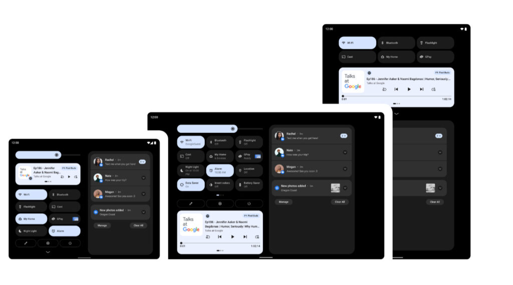 На големи екрани „щората“ за известия се възползва от пространството, като показва бързите настройки и известия в ново оформление с две колони. Заключеният екран също използва оформление с две колони, за да покаже известията и часовника, а системните приложения като “Настройки” също са оптимизирани.