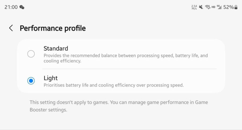 Вероятно поради увеличените работни честоти на CPU и GPU, Samsung са прибегнали до включването и на Light Mode (Low Power Mode) за Galaxy S23 Ultra, който ще намали консумацията на енергия чрез намаляване на производителността, без това да засяга честотата на опресняване на дисплея.
