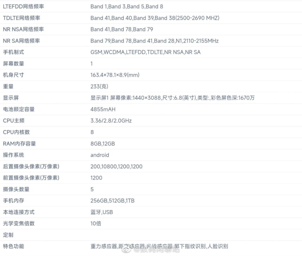 Тъй като по отношение на задните камери сертификатът показва много странна конфигурация (200MP + 108MP + 12MP + 12MP), Ice Universe смята, че е допусната грешка и камерите ще включват – 200MP основен сензор + 12MP ултраширок + 10MP 3x + 10MP с 10x оптично увеличение.