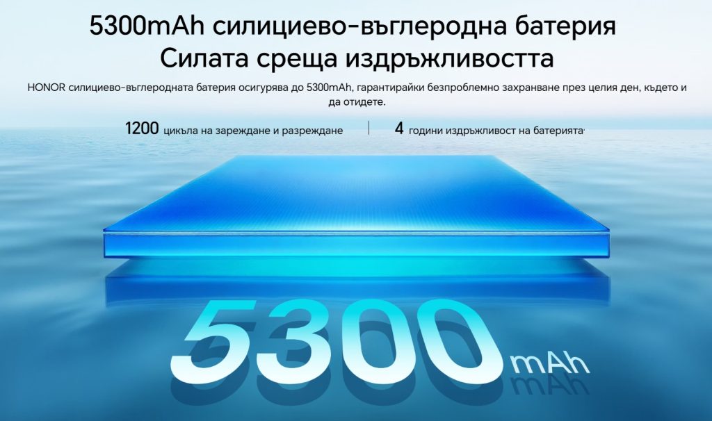 Батерията е проектирана за дълъг живот и запазва над 80% от капацитета си дори след 4 години. При използване на 66 W HONOR Wired SuperCharge, смартфонът се зарежда до 44% само за 15 минути.
