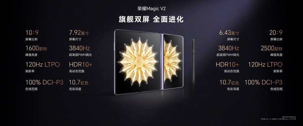 Magic V2 използва 6,43-инчов външен OLED дисплей от BOE с резолюция 2376×1060 пиксела и екранно съотношение 20:9. Екранът поддържа 120Hz LTPO честота на опресняване, 3840Hz високочестотно PWM затъмняване и сертификат от Rheinland TÜV за гладко изживяване без трептене. С максимална яркост от 1500 нита и пикова яркост от 2500 нита, Honor Magic V2 предоставя зашеметяващи визуализации с поддръжка на 1,07 милиарда цвята.
