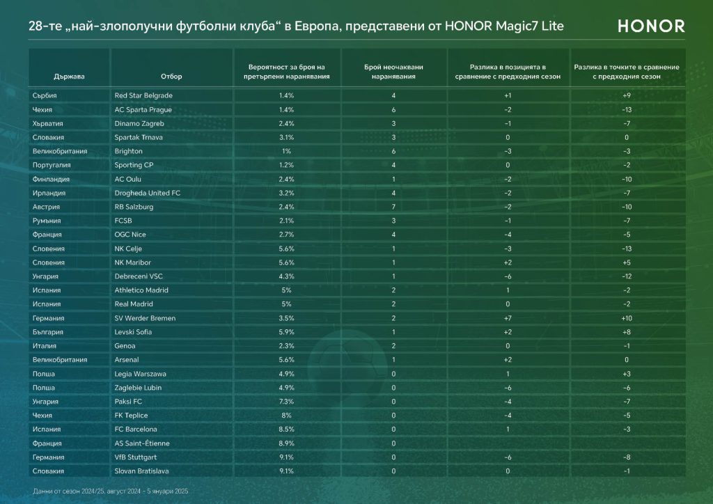 Авикар Джоли, главен маркетинг директор за HONOR в Европа, каза: „С наближаването на крайния срок за трансфери е удивително да видим как клубовете успяха да устоят на бурята от прекомерни контузии, като се очертаха както ясни победители, така и губещи. Футболът е трудна игра и контузиите са част от нея, подобно на HONOR Magic7 Lite – налага се да поемаш удари, но е нужно да си достатъчно силен, за да продължиш.”