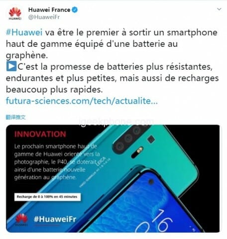 Наскоро споделиме слуха, че P40 ще бъде с графенова батерия с капацитет 5500 mAh. Днес Huawei France в Twitter порвърдихa тази новина, с уточнението, че капацитетът на графеновата батерия ще е 5000 mAh. Туитът бе изтрит, но бе видим достатъчно дълго, за да има и екранна снимка на тийзъра: