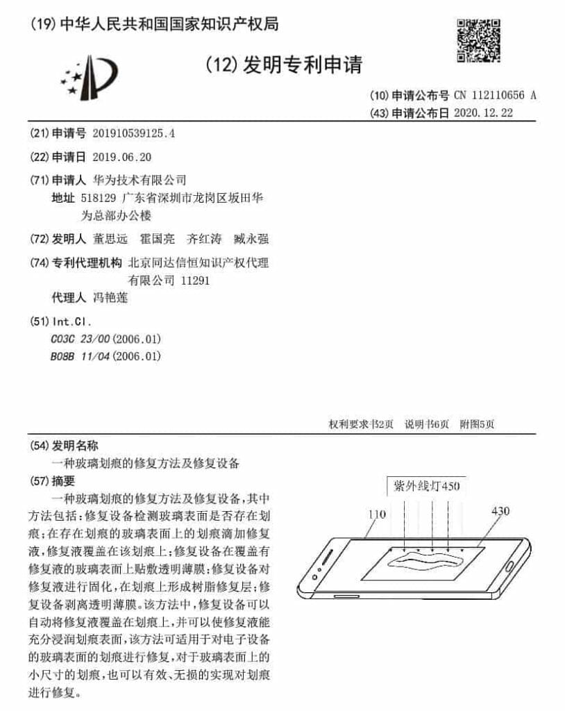 Huawei са подали заявление за нов патент в NIPO (National Intellectual Property Office ) – Националната служба за защита на интелектуалната собственост в Китай, публикъван на 22.12.2020г. с наименованието “Метод и оборудване за премахване на драскотини от стъкло”.
