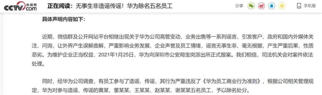 Вътешна информация за Huawei е изтичала в групи на WeChat, а след това и към някои китайски медии през януари 2021г. Разпространяваните слухове, свързани с компанията, мениджърите и продажбите ѝ, с имали негативно влияние върху репутацията на технологичния гигант Huawei.