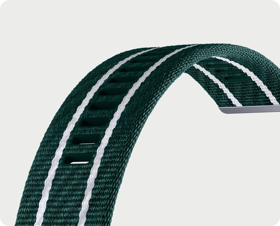 В допълнение към титаниевата верижка е предвидена и изящна тъканата каишка, която е дишаща, антибактериална и устойчива на пръски вода. Изработена е по усъвършенствана техника на тъкане, която осигурява балансиране на дебелината и мекотата на каишката.