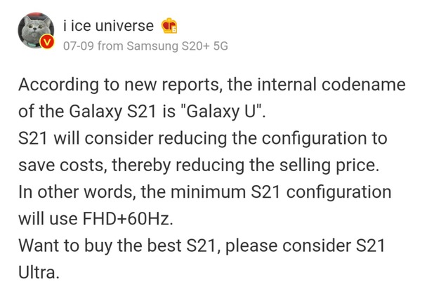 Според IceUniverse, от Самсунг обмислят и друг начин за намаляване на цената на Galaxy S21, като ползватдисплей с FHD+ резолюция, който поддържа честота на опресняване от само 60Hz. В сравнение с базовия модел на серията Galaxy S20, това е доста сериозен даунгрейд, като единствения бонус е, че клиентите ще получат най-новия и “най-добър” модел на по-ниска цена. С пост в своя Weibo-акаунт, китайският лийкър съветва клиентите, които искат да изживеят най-доброто от онова, което Samsung може да предложи за първата половина на 2021 г., да изберат Galaxy S21 Ultra.