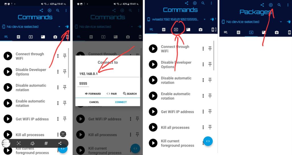 - Отваряте Bugjaeger и кликате на иконата на контакт горе в дясно. Тук ще Ви се покаже меню с IP адрес. За да видите адреса на часовника отново влизате в Настройки => Опции за разработчици => Отстр. грешки през Wi-Fi. След адреса в скоби [], ще видите подобен 192.168.0.102:5555. Това е адрес на часовника.
