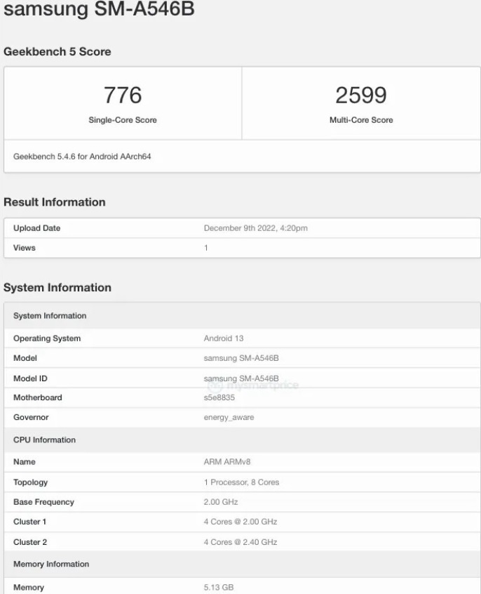 Според тестовете Galaxy A54 5G постига 776 в едноядрения тест и 2,599 в многоядрения. От тестовете можем да видим и, че прототипът разполага с 6GB RAM. Много е вероятно Samsung да има и версия с 8GB RAM.