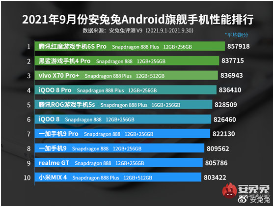 На втората позиция е друг геймърски смартфон – Black Shark 4 Pro, базиран на чипсета Snapdragon 888. Челната тройка се затваря от Vivo X70 Pro+, който, подобно на лидера е базиран на Snapdragon 888+ и предлага 12 GB RAM.