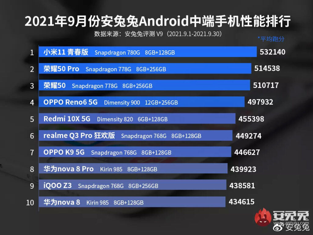 Redmi 10 X 5G е на пета позиция, оставяйки зад себе си Realme Q3 Pro и Oppo K9 5G, базирани на чипа Snapdragon 768G. В класацията успя да влезе и Huawei Nova 8 Pro, изграден на базата на Kirin 985, а същият процесор е инсталиран и в Huawei Nova 8, който затвори Топ 10 на най-мощните устройства в средния клас, пропускайки пред себе си iQOO Z3, заел девето място.