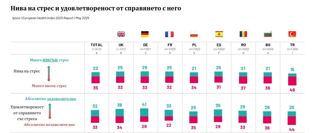Проучването показва, че 36% от българите съобщават за високи нива на стрес – едно от най-високите нива в Европа. Само 26% от анкетираните се чувстват удовлетворени от способността си да се справят със стреса, а 38% са неутрални.