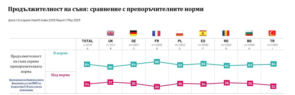 Сънят също е тема, за която знанията у анкетираните са оскъдни. 55% от българите не знаят каква е препоръчителната продължителност на съня според международните здравни стандарти. Жените показват по-високо ниво на осведоменост по темата, но също така са по-склонни да страдат от недоспиване. 35% от анкетираните спят под препоръчителните 7–9 часа, като този дял нараства с възрастта.