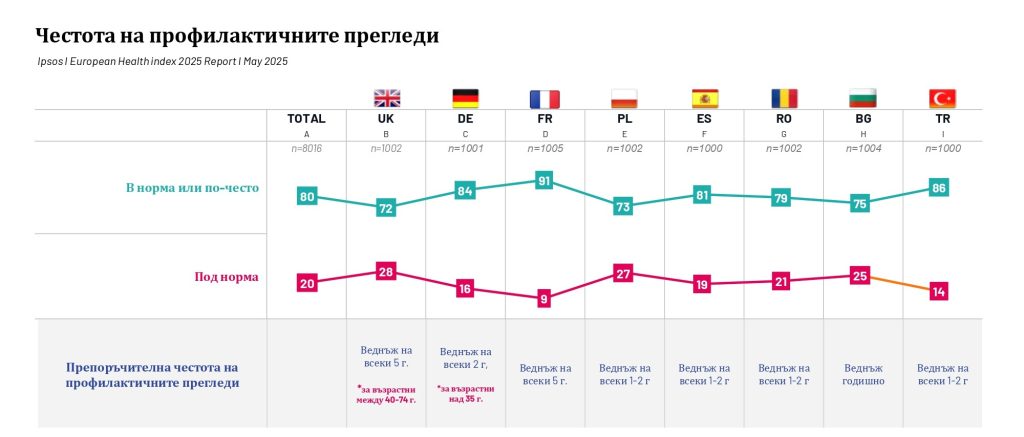 Макар българите да показват най-висока информираност сред всички изследвани държави, 53% все още не знаят препоръчителната честота на профилактика. Мнозина смятат, че трябва да се преглеждат 3–4 пъти годишно, въпреки че официалната препоръка в България е веднъж годишно.