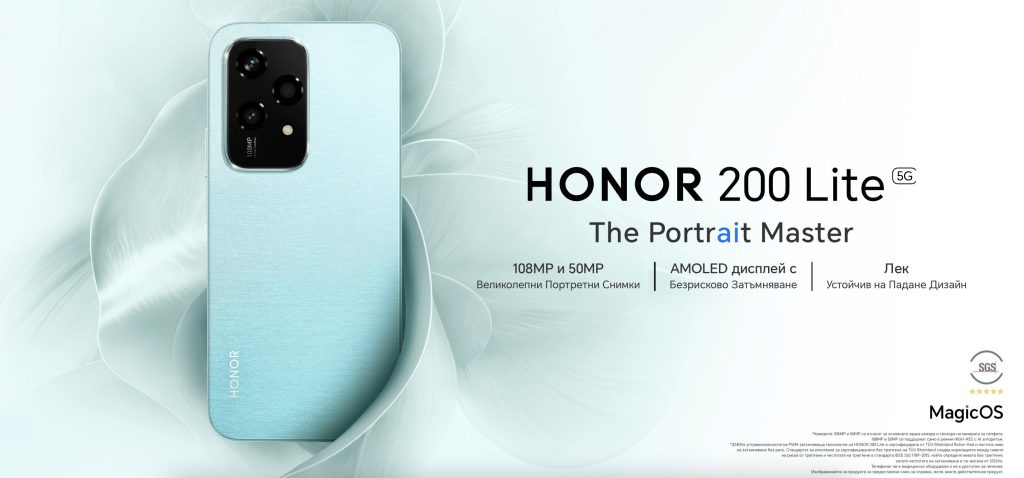 Част от празничната кампания е и Honor 200 Lite 5G. Смартфонът впечатлява с 6,7-инчов AMOLED дисплей със 120Hz опресняване и резолюция 2412×1080 пиксела, сертифициран за защита на очите.