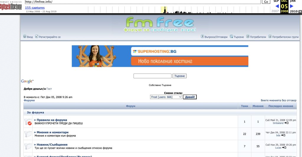 Форумът, който тогава създадох – FmFree.info, се разрасна толкова бързо, че в рамките на 2-3 години се нареди сред топ 10 на най-активните форуми в България, редом с форума на Data.bg. Това беше първият ми мащабен успех, който доведе и до първата ми продажба на 15-годишна възраст – и то за четирицифрена сума, което тогава беше доста сериозно. При минимална заплата от 240 лв. в онези години, това ми даде възможност да инвестирам в нови проекти.