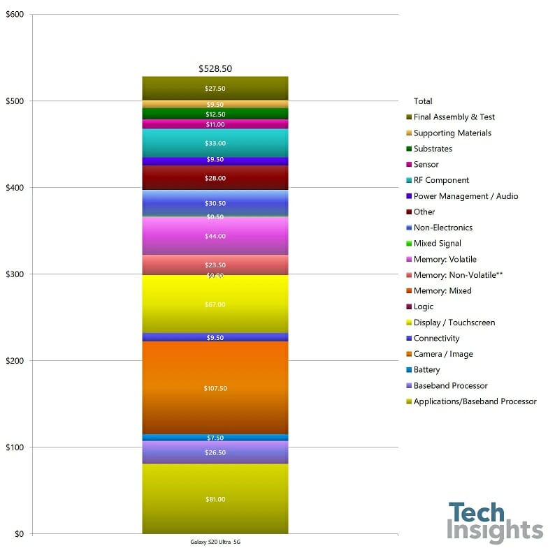 Любопитно ли Ви е колко точно струват компонентите в Galaxy S20 Ultra? Отговорът е $528.50, според Tech Insights, които са направили анализ на хардуера на смартфона. Компанията продава смартфона на цена около $1,400.