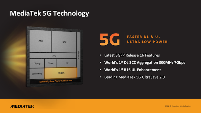 По отношение на 5G модема, MediaTek постигнаха доста голям успех със своите скорошни реализаци. Новият 5G модем надгражда постигнатото до момента, като рекламира за първи път 3CC агрегация на оператора с до 300MHz честотна лента (Sub-6), което позволява скорост на изтегляне до 7Gbps.