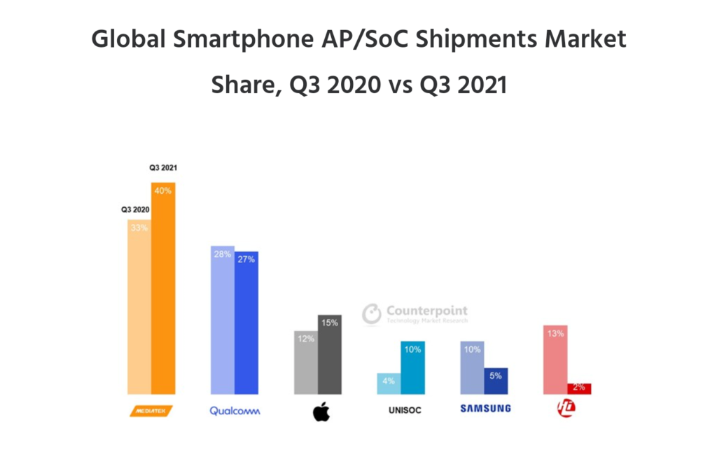 Според скорошен доклад на Counterpoint Research, делът на MediaTek на пазара на чипсети за смартфони към третото тримесечие на 2021 г. възлиза на 40%, което показва увеличение от седем процентни пункта в сравнение със същия период на 2020 г.