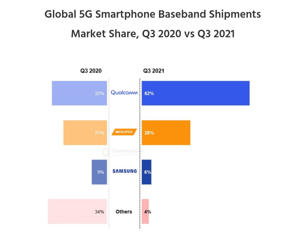 Не всичко изглежда загубено за Qualcomm, ако погледнете данните от друга гледна точка. Компанията продължава да бъде безспорен лидер в сегмента на 5G чипсети, с огромен пазарен дял от 62% към третото тримесечие на 2021 г.