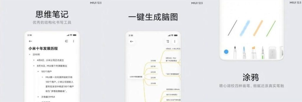 Xiaomi са преработили приложението за бележки Notes в MIUI 12.5. Потребителите вече могат да добавят бързи бележки, да генерират мисловни карти (хронология на бележките), само с един клик. Предлага се и функция за графити, и е оптимизирано е рисуването с пръсти.
