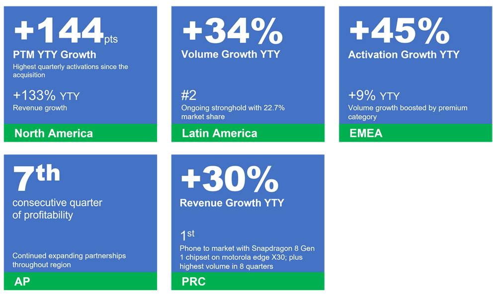 В световен мащаб се наблюдава значителен ръст в пазарния обем на Mobile Business Group (MBG) с трицифрена стойност в Северна Америка, Европа и Азиатско-Тихоокеанския регион, а в Латинска Америка е достигнат и нов рекорден пазарен дял. В България, бранда Motorola също отчита значителен ръст.