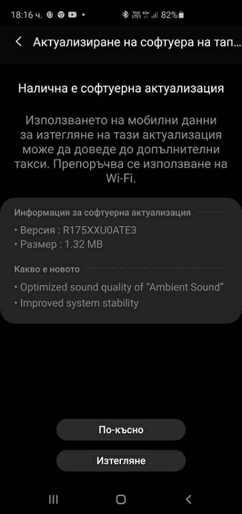 Samsung стартираха разпространението на нова актуализация за слушалките Galaxy Buds+. Версията на фърмуера е R175XXU0ATE3, и е с размер от 1.32MB. Подобно на предходния ъпдейт и тук Samsung са споменали оптимизация на Ambient Sound (околния шум).