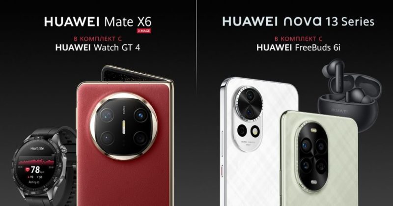 До 3 март 2025 г. сгъваемият флагман Huawei Mate X6 ще се предлага в комплект с Huawei Watch GT 4 и 100W зарядно, а смартфоните от серията Huawei nova 13 заедно с TWS слушалките Huawei FreeBuds 6i и също със 100W захранващ адаптер.