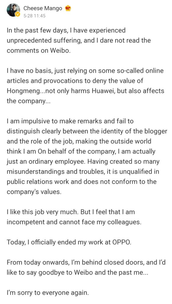 Оказва се, че той си е позволил да критикува операционната система HarmonyOS на Huawei. В резултат на тези коментари, служителят е трябвало да напусне поста си. И всичко това поради факта, че по собствените му думи, той е опетнил името на Oppo, а коментарите му са интерпретирани като отношението на самата компания към операционната система.