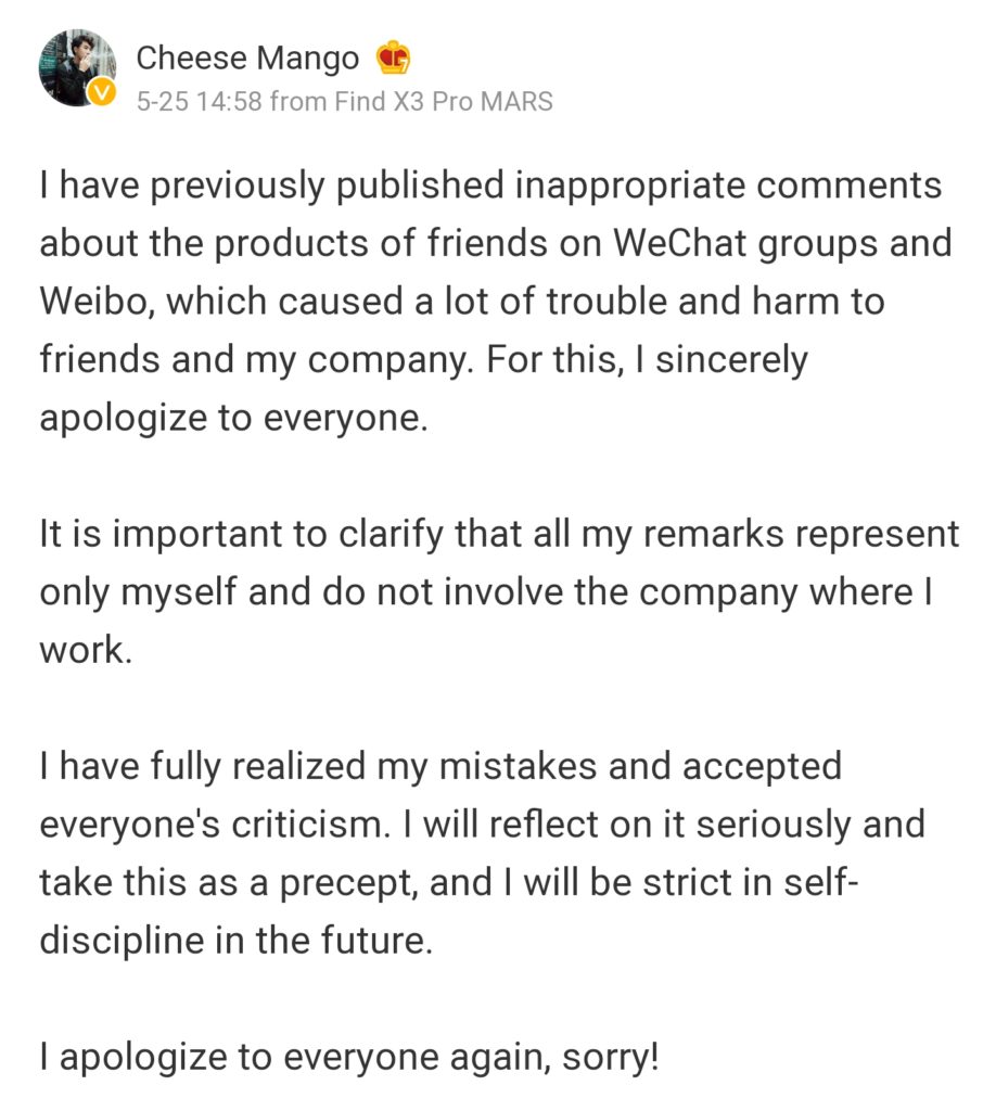Служителят @ 芝士 芒 胖 обясни в Weibo своята позиция:
