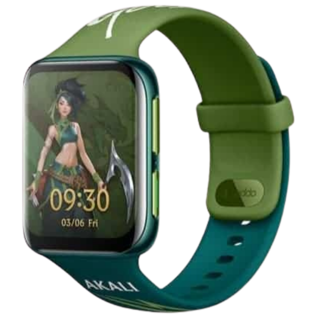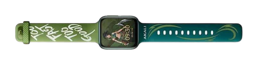 Както се очакваше, Oppo Watch League of Legends се предлага с ексклузивна персонализирана тема за Akali. Умният часовник е оборудван с каишка с тематика Akali с два нюанса на зелено, които ще откриете в облеклото на героинята. Можете дори да видите, че от едната страна на каишката е изписано името Akali. Другата част, съдържа текста „Твърде бързо, твърде добре“.