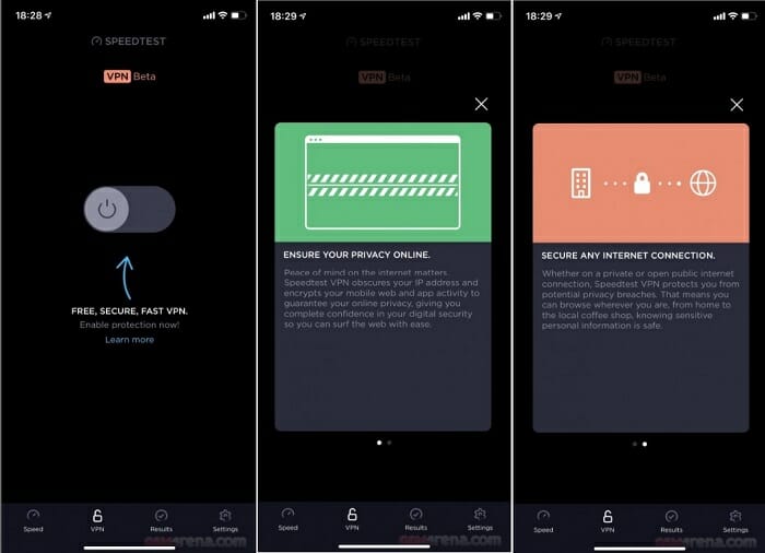 Speedtest VPN работи на принципа, по който функционират повечето VPN апликации за мобилните платформи. Докосвате съответния бутон, след което изскача прозорец, който ще Ви попита дали да добави VPN свързване към Вашето устройство. След това целия интнернет трафик на моблното устройство ще бъде криптиран, и може да получите достъп до недостъпни сайтове за Вашия регион – в замяна на една идея по-бавна интернет връзка.